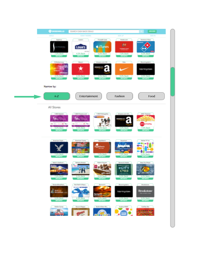 Here I added a filter which I think would be helpful to the user. If the user wanted to spend their savings on a restaurant for example, they would have to scroll through the entire list, possibly missing unfamiliar restaurants because they don't know the name. Including a filter makes it easier for the user to view a type of gift card without having to search the entire list. As the company grows and more gift cards are added, this will become increasingly daunting. Research has shown that too many options can actually dissuade purchasing.